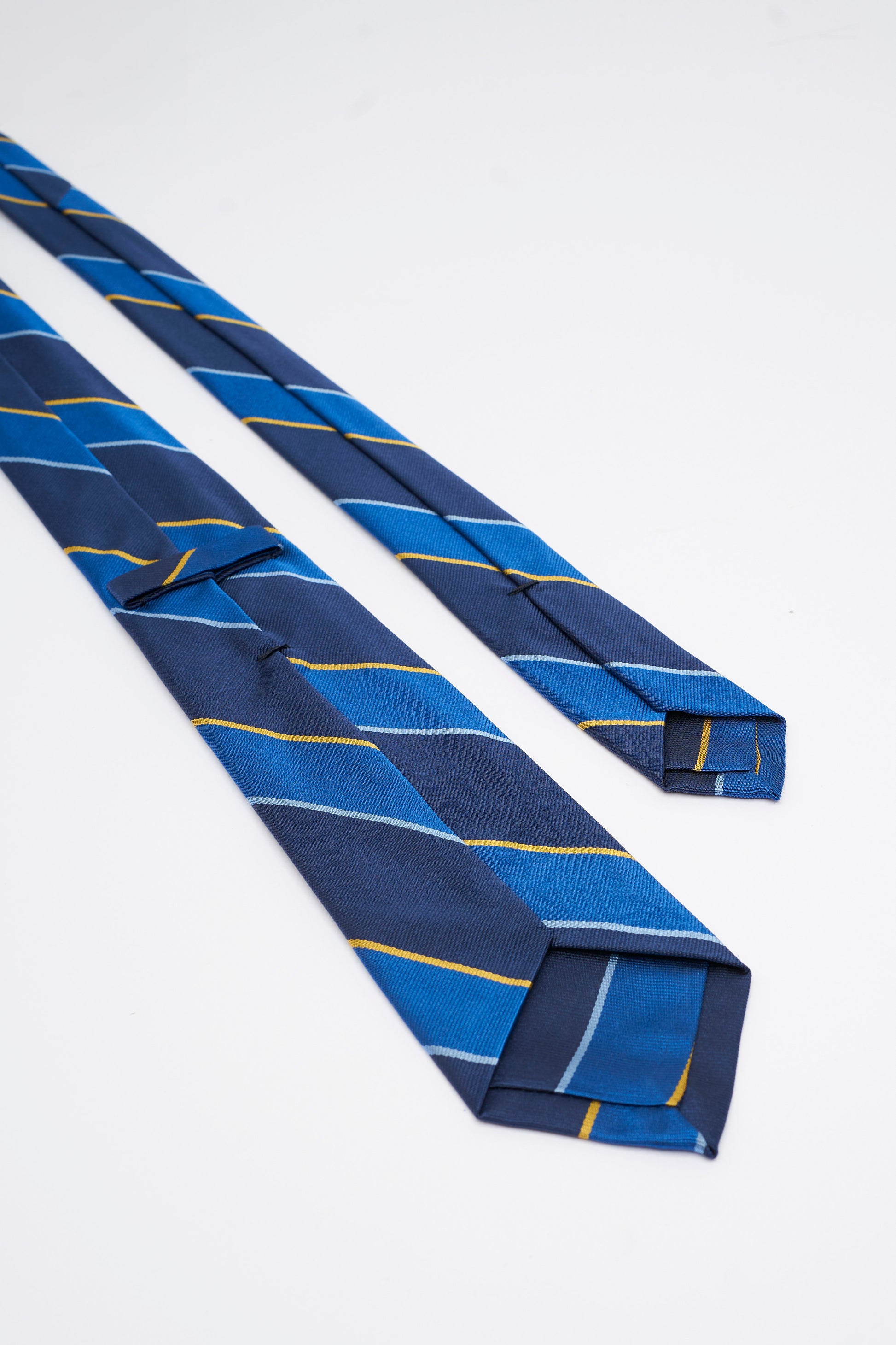 Questa cravatta sartoriale in pura seta di Como presenta un elegante motivo a righe nei toni del blu e blu navy perfetta per chi ama uno stile raffinato con un pizzico di energia. La combinazione cromatica aggiunge freschezza e versatilità al look, mentre la lavorazione a 7 pieghe assicura struttura e durata nel tempo.