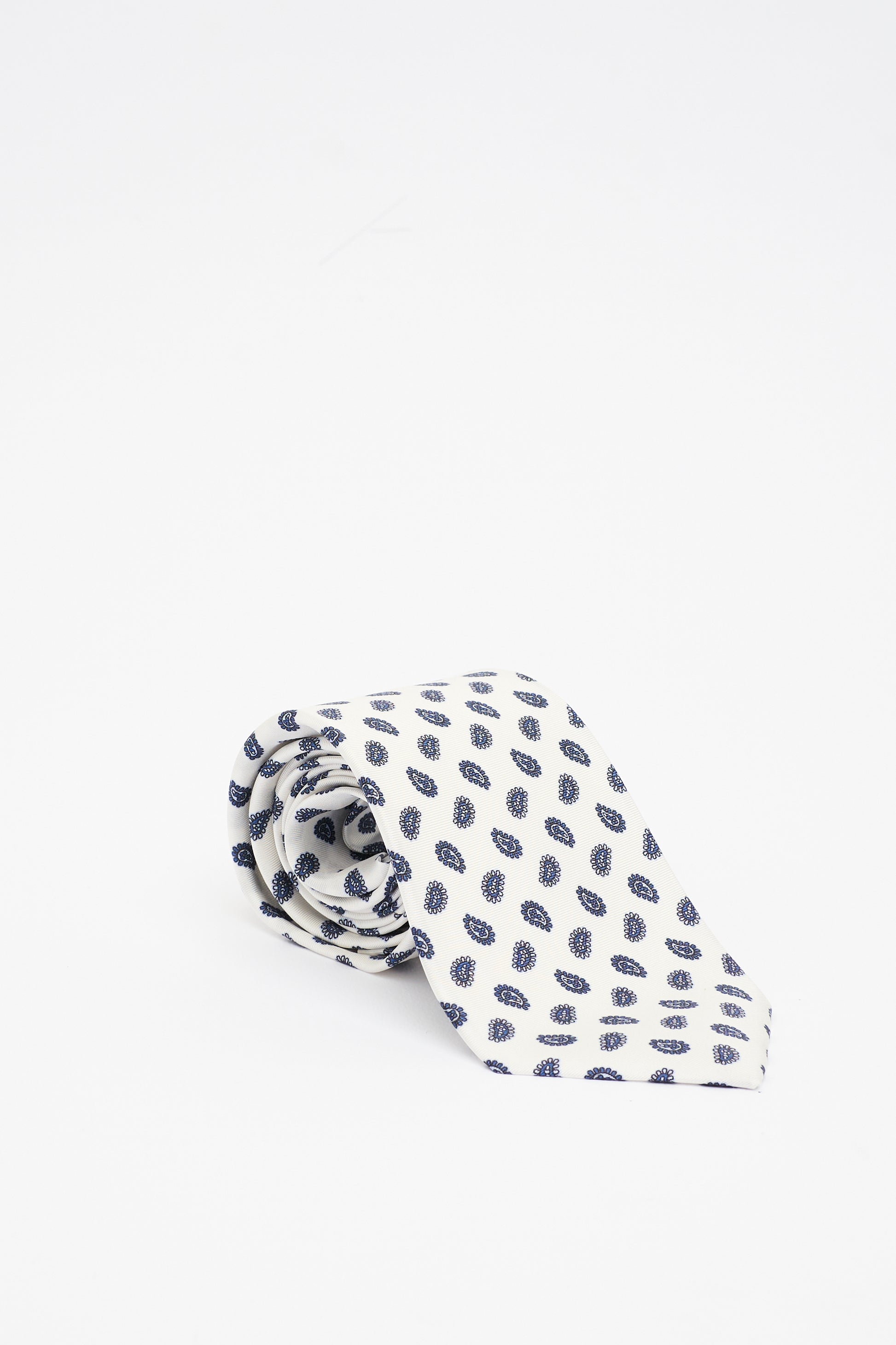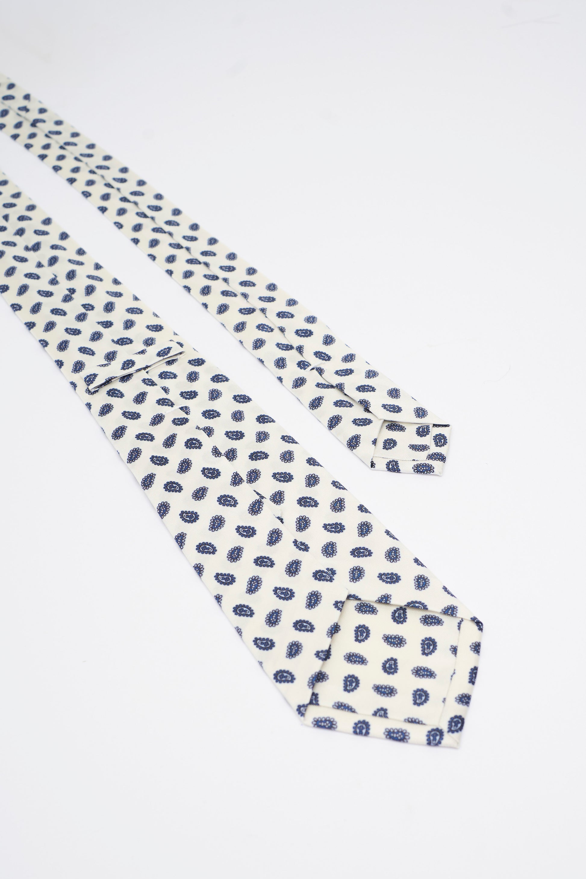 Questa cravatta sartoriale in pura seta di Como bianca è impreziosita da un raffinato motivo paisley che aggiunge movimento e personalità al look. La sobrietà del bianco si unisce alla ricchezza del disegno per un accessorio sofisticato e versatile, perfetto per le occasioni formali e per chi ama distinguersi con discrezione. La lavorazione a 7 pieghe valorizza la struttura e la qualità del tessuto, mentre il filo di tensione garantisce una vestibilità impeccabile nel tempo.