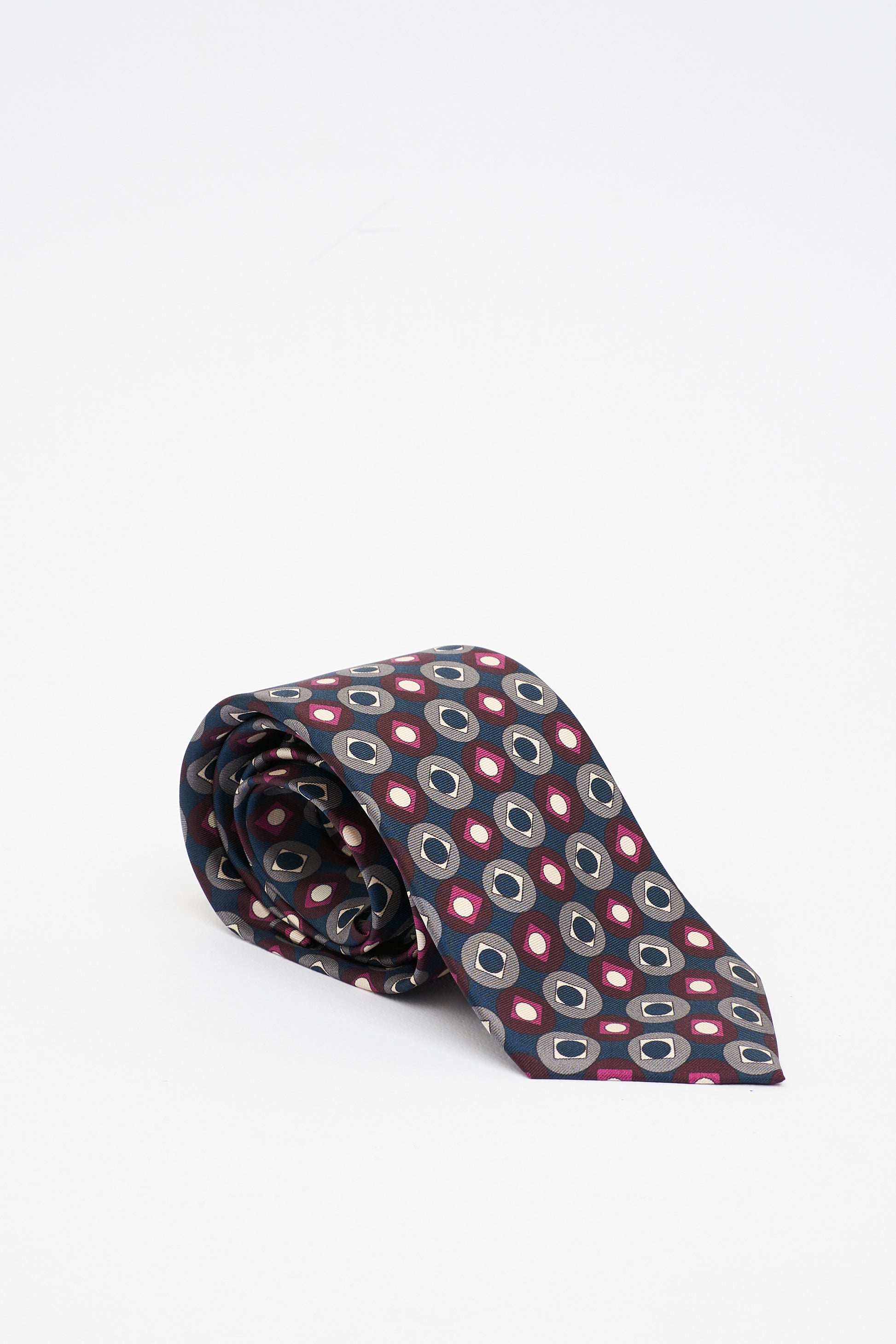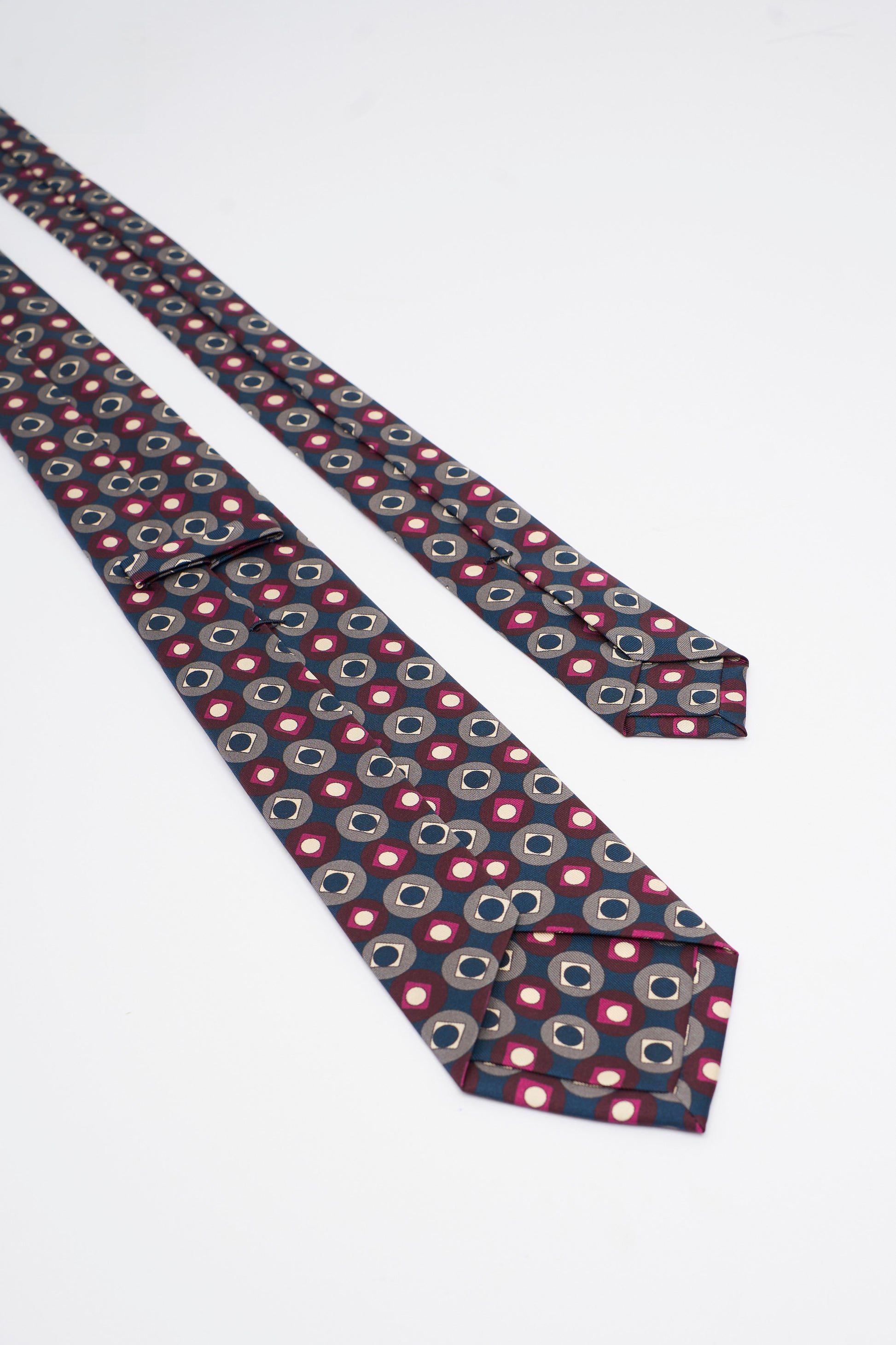 Questa cravatta sartoriale in pura seta di Como presenta un motivo geometrico vintage ispirato agli anni 70 dai toni del blu grigio bordeaux e fucsia che dona un tocco di personalità e originalità al look. La combinazione di colori audace e il design retrò creano un accessorio unico, perfetto per chi ama distinguersi con stile e raffinatezza. La lavorazione a 7 pieghe assicura struttura e durata mentre il filo di tensione garantisce una vestibilità impeccabile nel tempo.