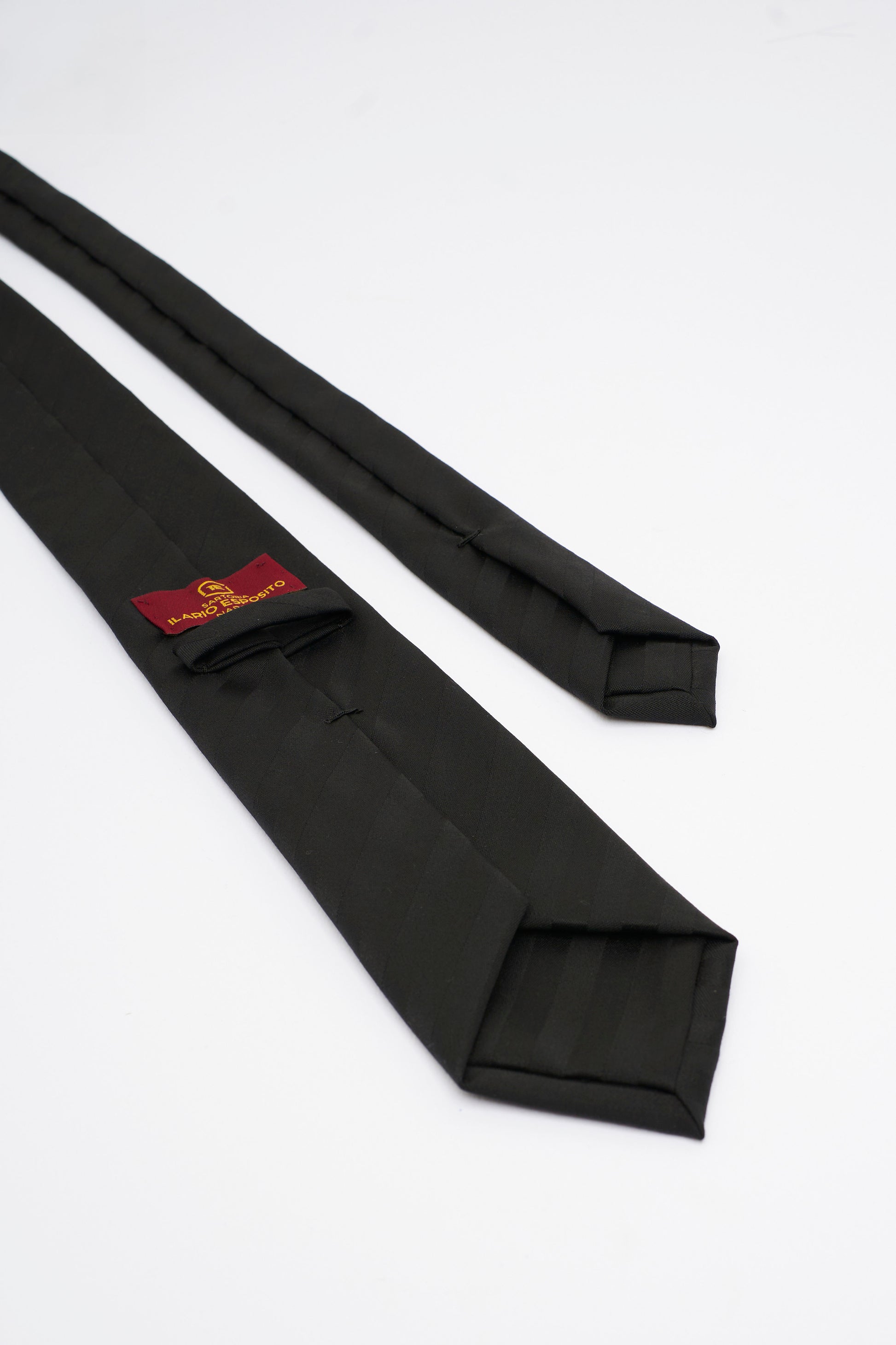 Questa cravatta sartoriale in pura seta di Como nera è impreziosita da un raffinato motivo tono su tono che aggiunge profondità e personalità al look senza rinunciare alla sobrietà. La tonalità nera profonda si abbina perfettamente a qualsiasi outfit formale, rendendo questa cravatta un accessorio versatile e di classe. La lavorazione a 7 pieghe garantisce struttura e durata, mentre il filo di tensione assicura una vestibilità impeccabile nel tempo.